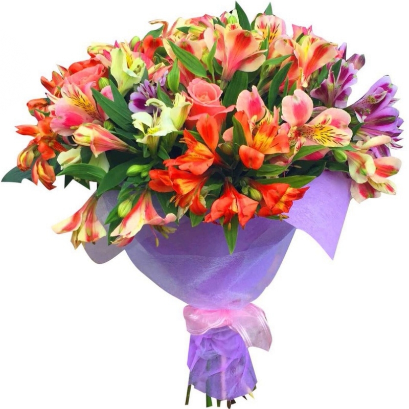 Букет состоит из 15 веток альстромерий, 3 розовые розы, зелень, красивая упаковка, атласная лента.