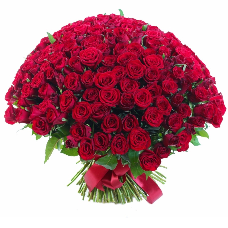 Букет состоит из 201 красная роза, зелень, прозрачная упаковка, атласная лента.
